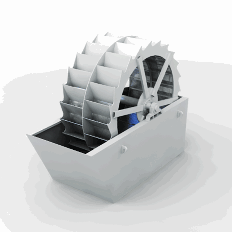 在工作时,轮式洗砂机的电机通过三角带、减速机、齿轮减速后带动叶轮缓慢转动,砂石经给料槽进入洗槽中,在叶轮的带动下翻滚,并互相研磨,除去覆盖砂石表面的杂质,同时破坏包覆砂粒的水汽层,以利于脱水。同时加水,形成强大水流,及时将杂质和比重小的异物带走,并从溢出口洗槽排出,完成清洗作用。干净的砂石由叶片带走,最后砂石从旋转的叶轮倒入出料槽,完成砂石的清洗作用。而螺旋洗砂机则需倾斜布置,水槽下部由三边堰板包围形成沉淀池,螺旋头部没入沉淀池内,螺旋由电动机经减速器,驱动连续旋转,由沉淀池底部多孔板给入清洗水。该设备兼有清洗、脱水、分级三种功能。