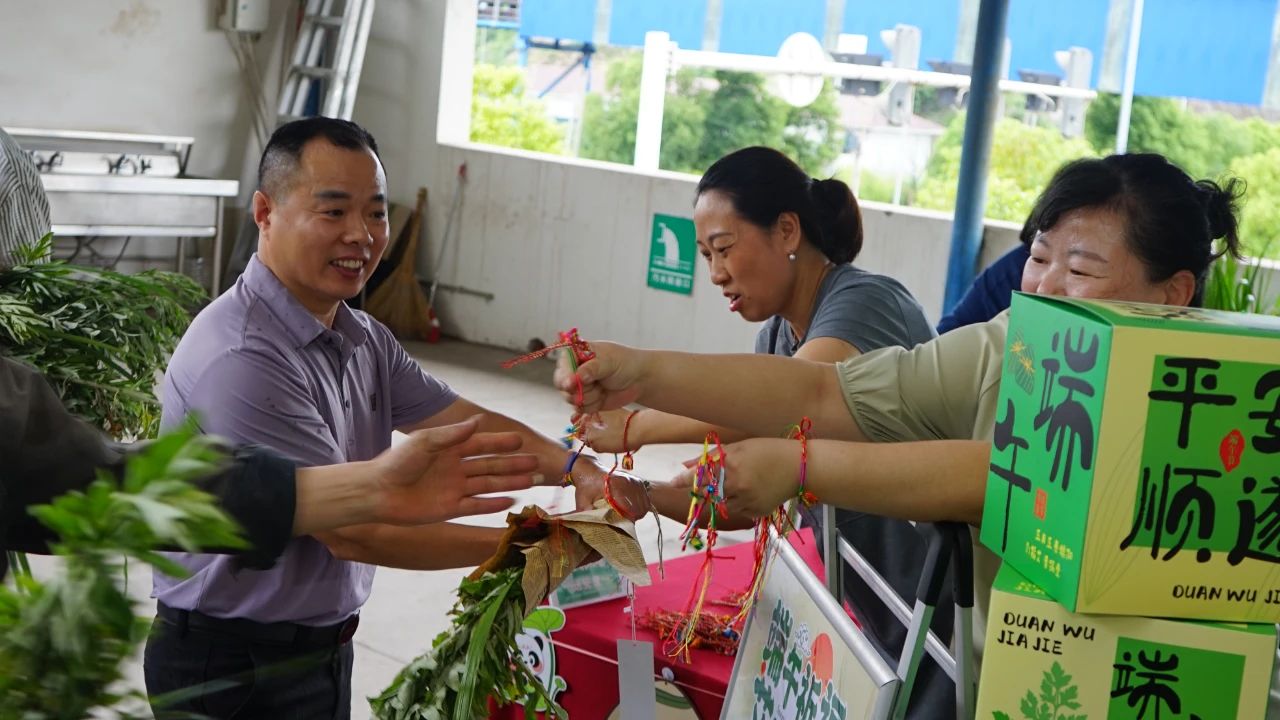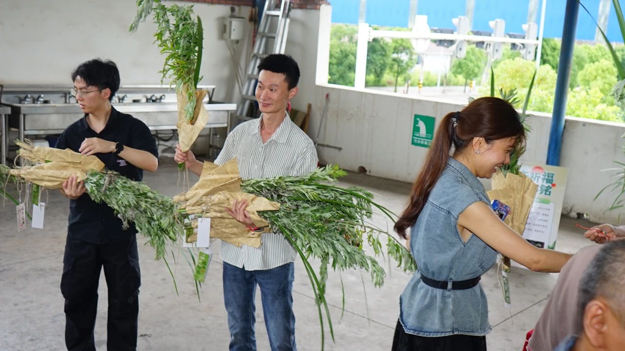 青青艾草,福瑞盈门。员工们亲手扎制艾草花束,艾叶的辛香与菖蒲的挺拔相映成趣。这亲手制作的“百福草束”,是传统“招百福”吉物的演绎。长桌铺陈,青翠的艾叶与淡雅的菖蒲整齐排列,绿意盎然。三铭领导与员工分发艾草花束,将祝福与期许细细缠绕。